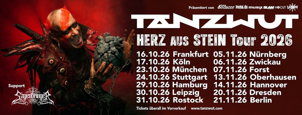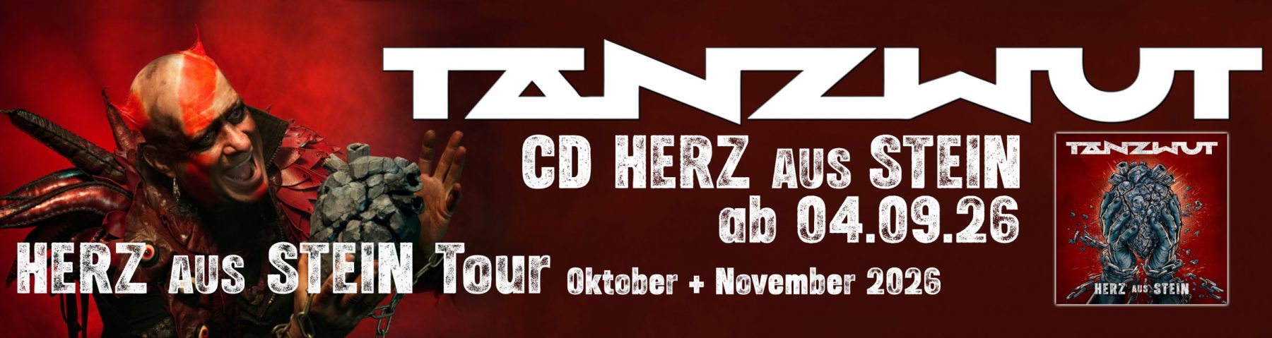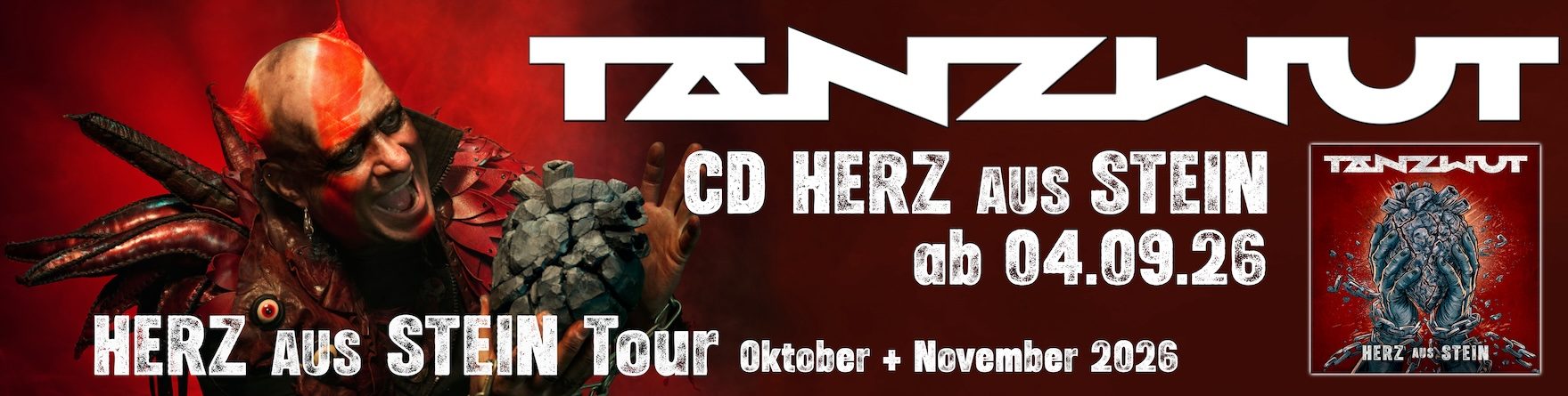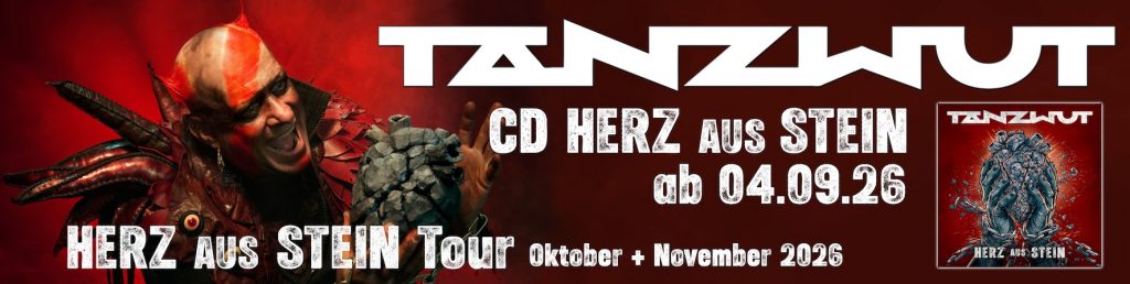 Am 04.09.2026 schlägt ein neues Kapitel auf: „HERZ AUS STEIN“ erscheint in mehreren besonderen Editionen für Sammler und Fans. Neben der edlen Grey Black Dust Vinyl und dem CD-Digipak gibt es exklusiv im NoCut- & TANZWUT-Shop zwei außergewöhnliche Varianten – die Red Marbled Vinyl sowie die faszinierende Liquid Vinyl (Black Layered, Grey Fluid). Für alle, die mehr wollen als nur Musik, wartet die streng limitierte Fanbox – weltweit auf nur 666 Stück begrenzt. Sie ist mehr als ein Release, sie ist ein Erlebnis: